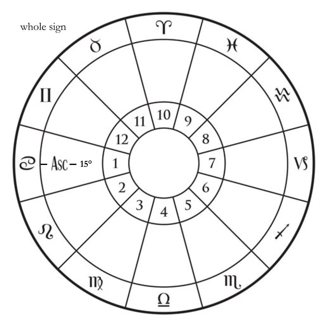 WHOLE SIGN – This is the oldest system of house division dating back to the 1st century BCE. The main qualities we attribute to the different houses were developed using this house system. Each house begins at 0° and is 30° in size. The 1st house is determined by your Ascendant Sign regardless of what degree your Ascendant is at. For instance, if your Ascendant is at 15° Aries, your Ascendant would be right in the exact middle of your 1st house.