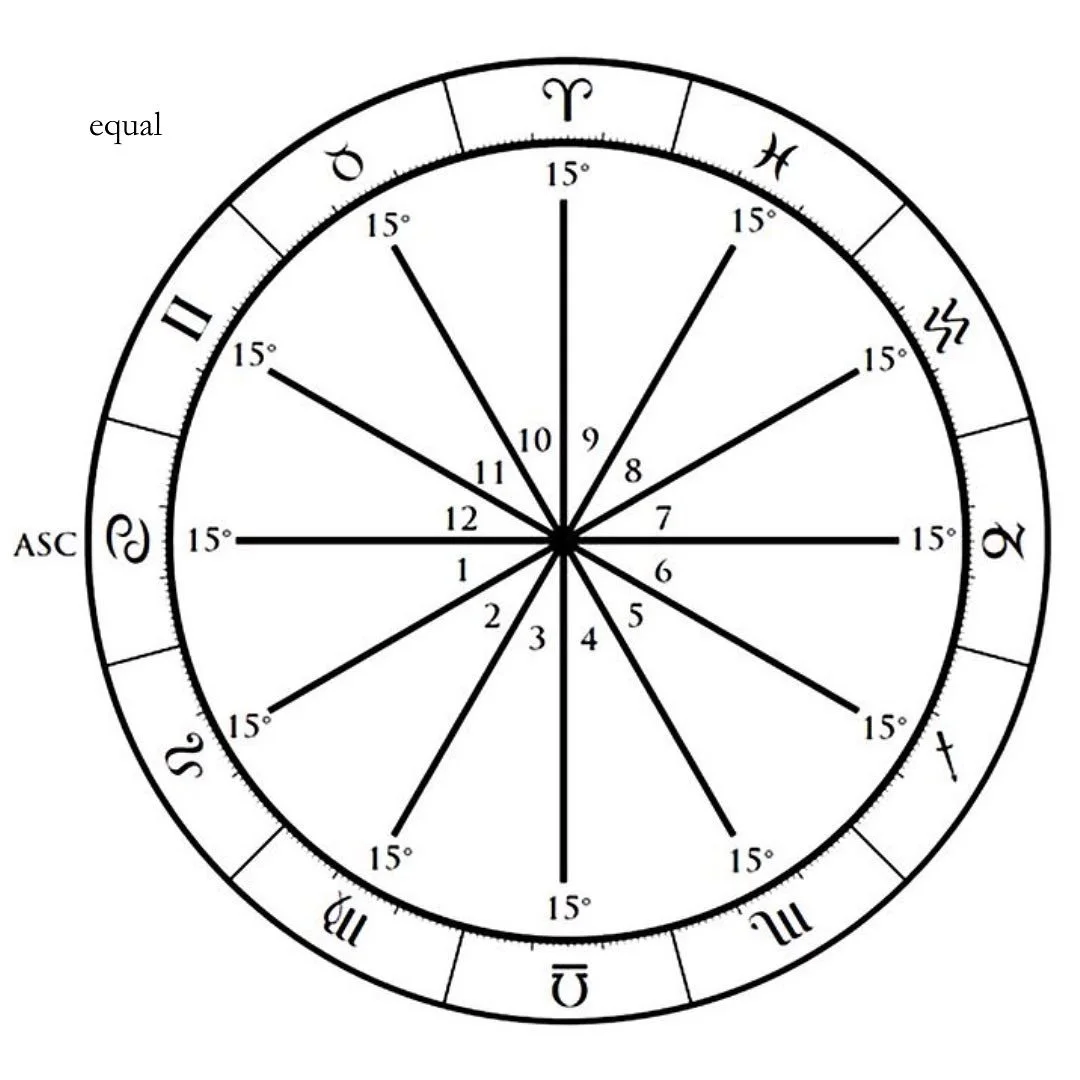 EQUAL – This system dates back to the 1st century CE and was initially used as a secondary overlay to the primary system of Whole Sign for the purposes of specific techniques (as opposed to general purposes like reading a birth chart). Like Whole Sign, each house is 30° in size but the degree of the Ascendant is where the 1st house begins. For instance, if your Ascendant is at 15° Aries, 15° Aries is where your first house begins, 15° Taurus is where your 2nd house begins and so on.